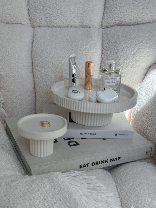 Elevate your home decor with this unique pedestal ribbed round tray that combines elegance with functionality. Set on a beautifully scalloped, ribbed base, this tray brings texture, balance, and modern charm to any space. Perfect for showcasing perfumes, jewelry, candles, or other daily essentials, it adds a subtle statement to your coffee table, dining table, or vanity. Its neutral and aesthetic design makes it easy to blend into a variety of interior styles—from minimalist to boho to modern classic. A refined accent piece that’s as practical as it is beautiful.